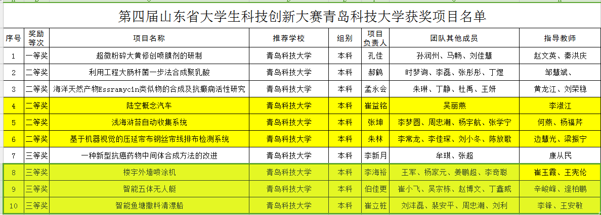 近日,山东省教育厅下发《山东省教育厅关于公布第四届山东省大学生科技创新大赛获奖名单的通知》(鲁教高字[2017]12号)。青岛科技大学荣获优秀组织奖,共荣获一等奖1项,二等奖5项,三等奖4项,其中永利yl23411no1获二等奖3项,三等奖3项,参赛作品数量和获奖数量位居学校前列。