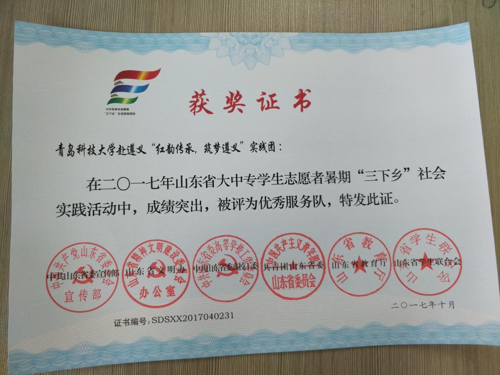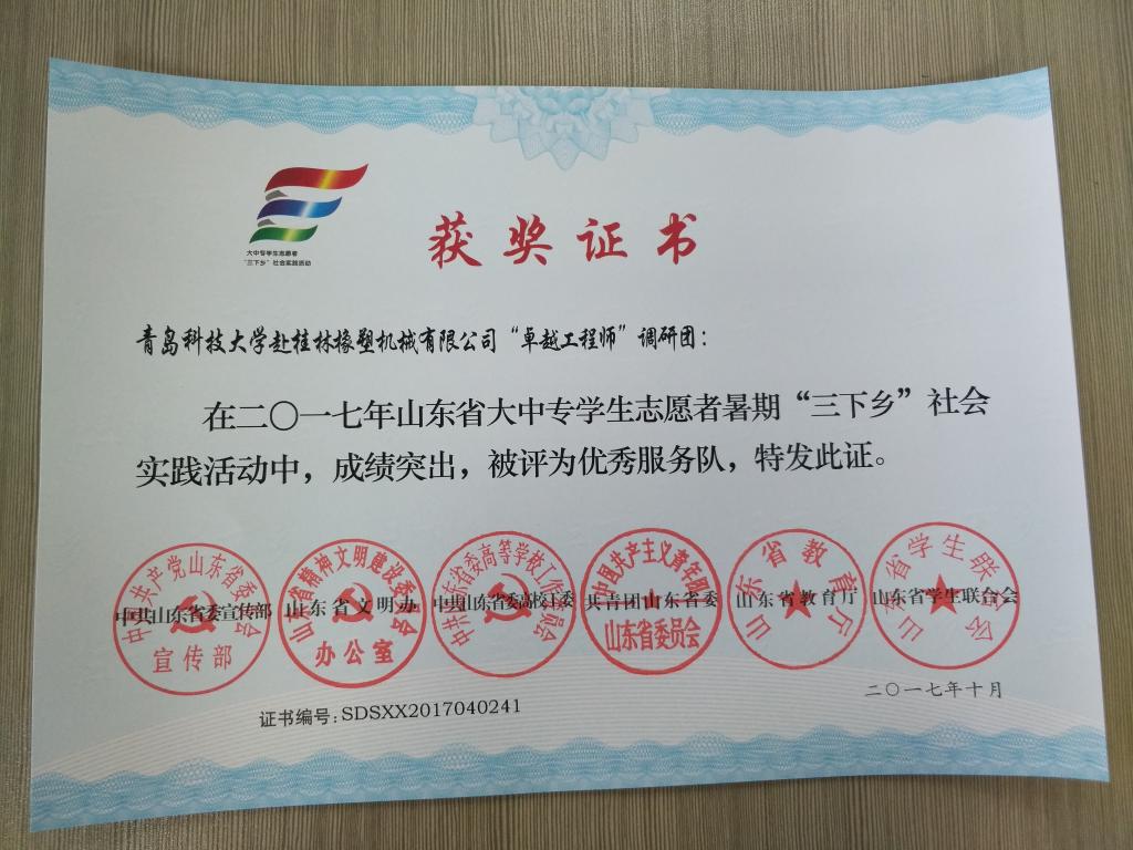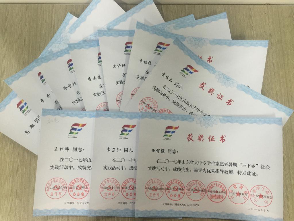 近日,2017年山东省大中专学生志愿者暑期文化科技卫生“三下乡”社会实践活动先进集体和先进个人的证书下发,永利yl23411no1赴桂林橡塑机械有限公司“卓越工程师”调研团、赴遵义“红韵传承,筑梦遵义”实践团2支队伍获得2017年山东省优秀服务队称号,王作辉、曲智强、李东阳被评为2017年山东省社会实践活动优秀指导教师,高翔、李开、冷雪靖、李大志、宋沂轩、李福祯、董佳乐7名学生荣获2017年山东省社会实践活动优秀学生。