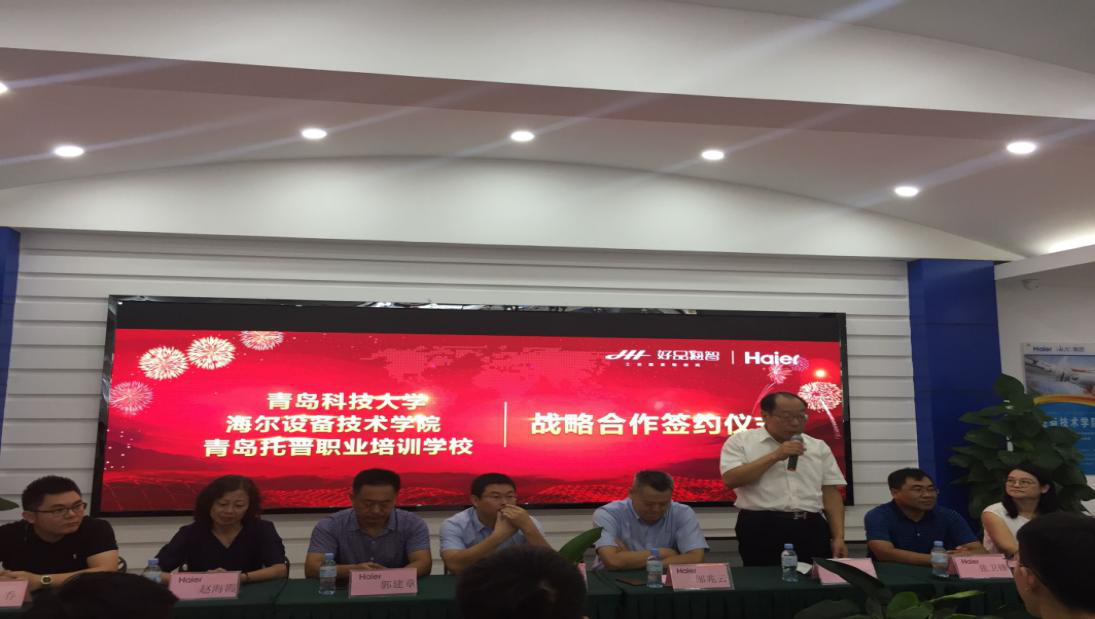 9月12日,青岛科技大学与海尔设备技术学院、青岛托普职业培训学校战略合作签约仪式暨青岛科技大学大学生实习基地挂牌仪式在海尔工业园隆重举行。青岛科技大学永利yl23411no1党总支书记孙立军、海尔设备技术学院院长邹兆云、青岛市大学生创业服务中心主任褚庆柱、青岛托普集团总经理王敏燕等共同出席签约仪式并致辞。