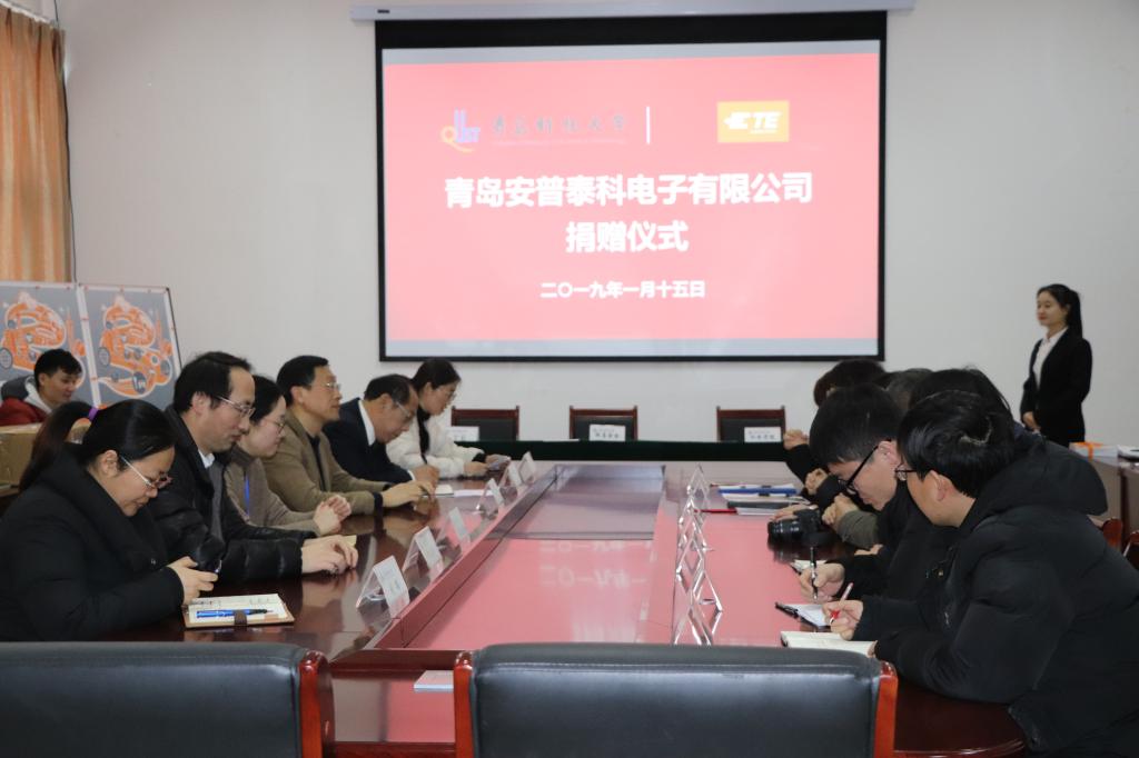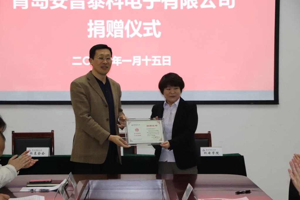 1月15日上午,青岛安普泰科电子有限公司捐赠仪式在机电大楼518会议室隆重举行。校友办主任兼教育发展基金会秘书长聂广明、永利yl23411no1党总支书记孙立军、永利yl23411no1党总支副书记兼副院长王伟、校教育发展基金会基金管理主任顾珊珊、青岛安普泰科电子有限公司总经理刘国庆、人力资源部总经理黄青霞等参加了仪式。仪式由王伟主持。