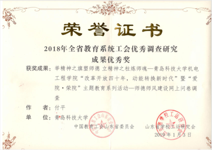 近日,永利yl23411no1分工会付平老师结合我院工会工作实际,所申报的《举精神之旗塑师德 立精神支柱炼师魂---青岛科技大学永利yl23411no1“改革开放四十周年,动能转换新时代”暨“爱院·荣院”主题教育系列活动---师德师风建设网上问卷调查》在全省100多项作品中脱颖而出,获得2018年全省教育系统工会优秀调查研究成果优秀奖。