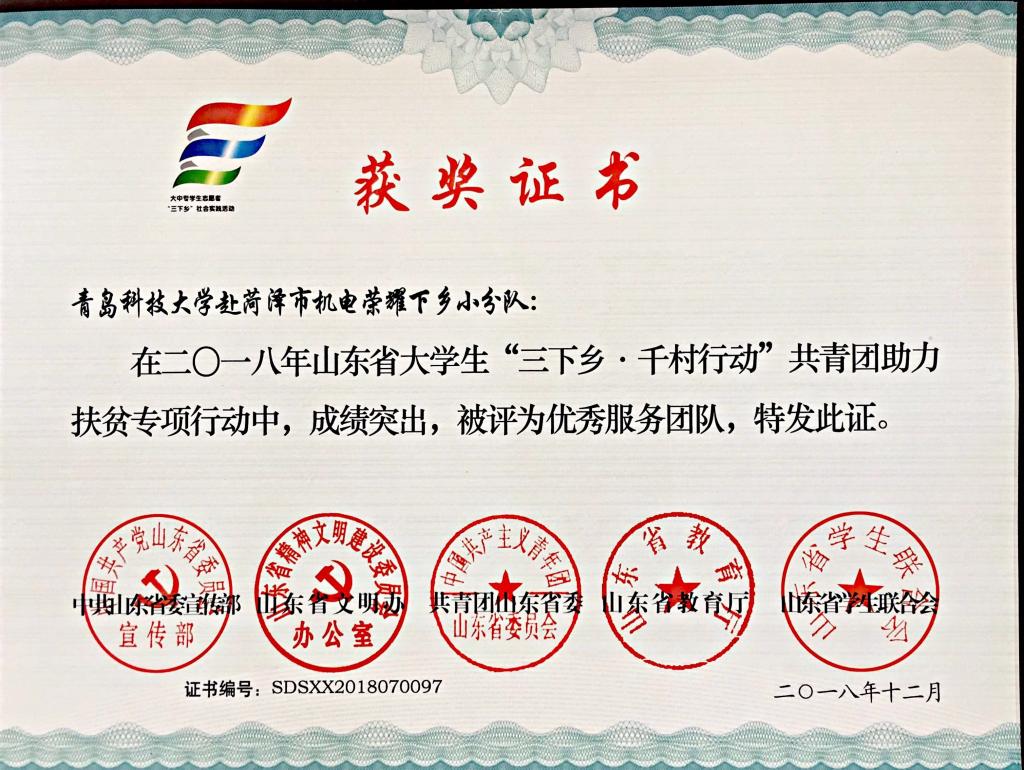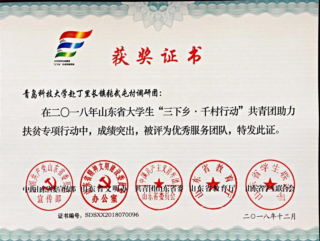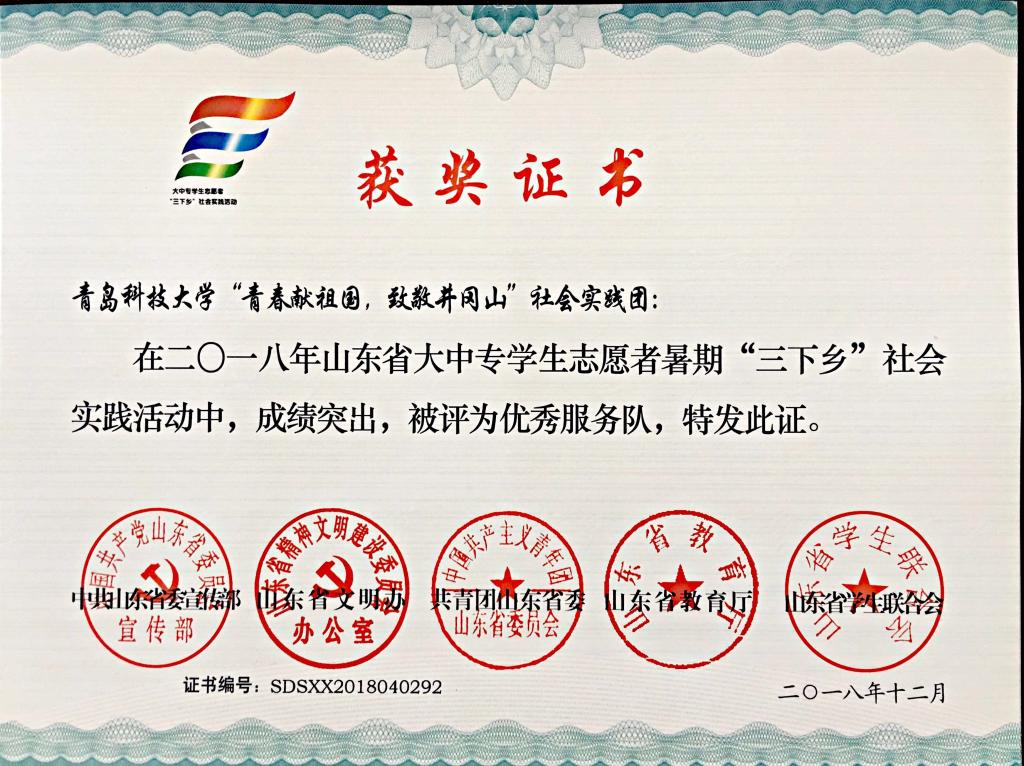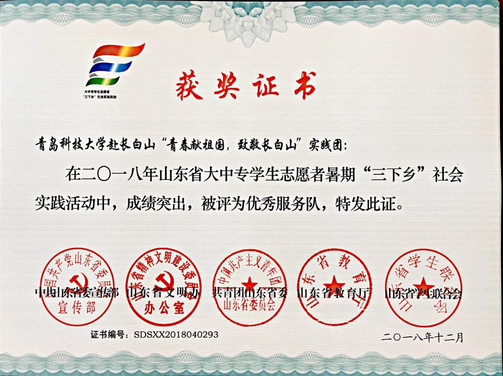 近日,2018年山东省大中专学生志愿者暑期文化科技卫生“三下乡”社会实践活动先进集体和先进个人的证书下发,永利yl23411no1“青岛科技大学赴长白山‘青春献祖国 致敬长白山’实践团” “青岛科技大学赴长白山‘青春献祖国 致敬井冈山’实践团”获“三下乡”社会实践省级优秀服务队, “青岛科技大学赴菏泽市机电荣耀下乡小分队”、“青岛科技大学赴丁里长镇张武屯村调研团”获“三下乡·千村行动”共青团助力扶贫专项行动省级优秀服务团队,曲智强、李东阳获 “三下乡·千村行动”共青团助力扶贫专项行动社会实践活动优秀指导教师,王娟娟、苗清获“三下乡”社会实践活动优秀指导教师,毕岚森等多名学生获 “三下乡”社会实践优秀学生。