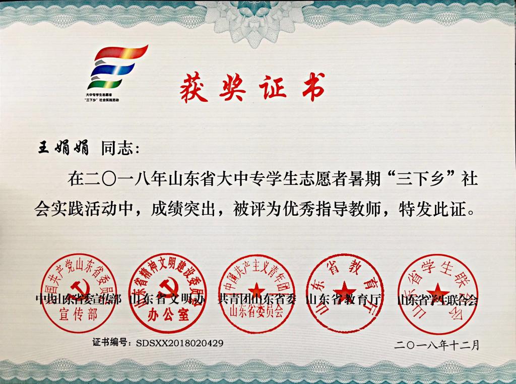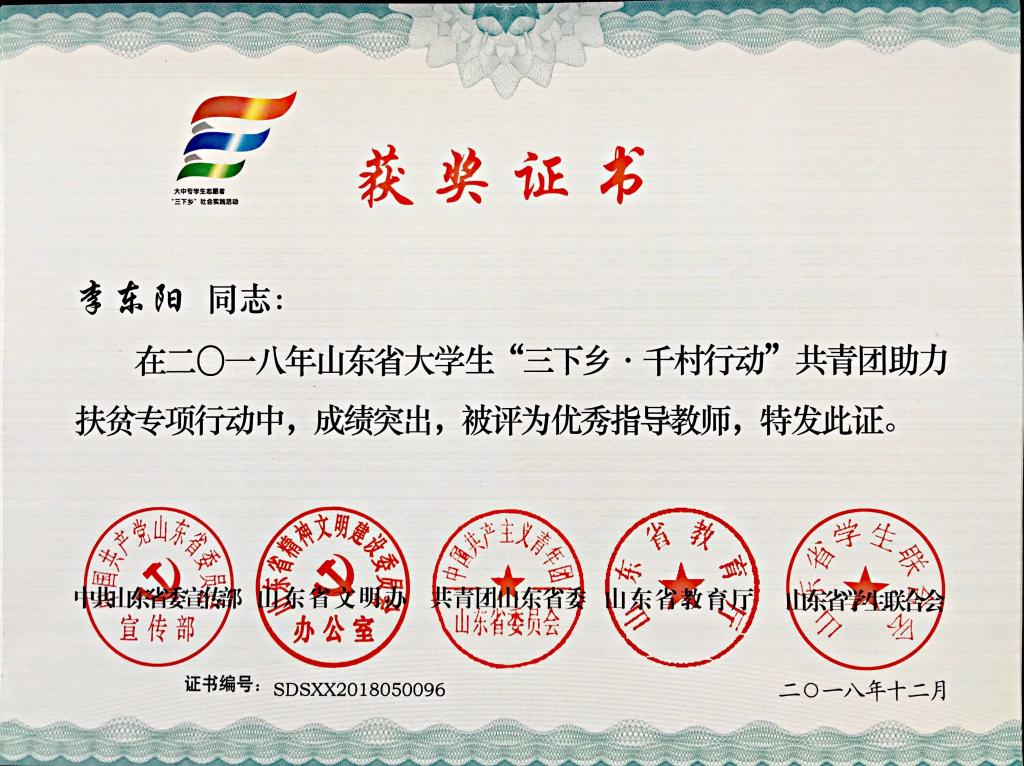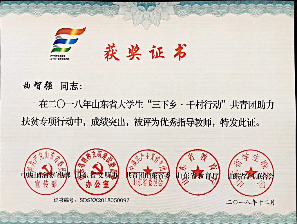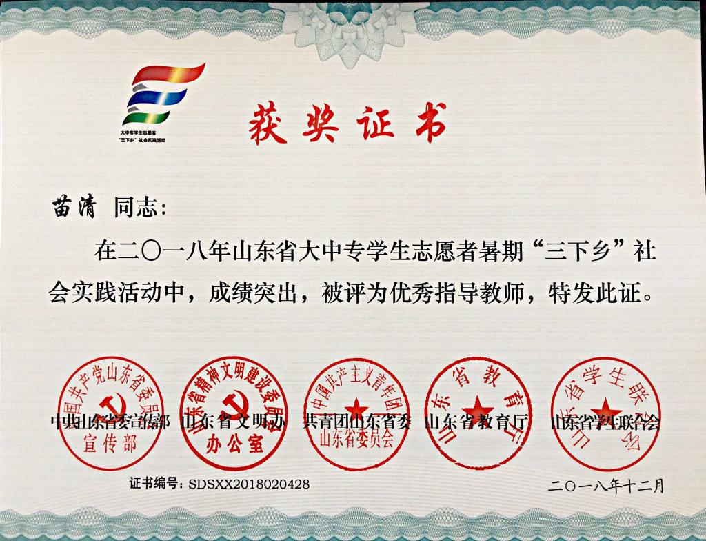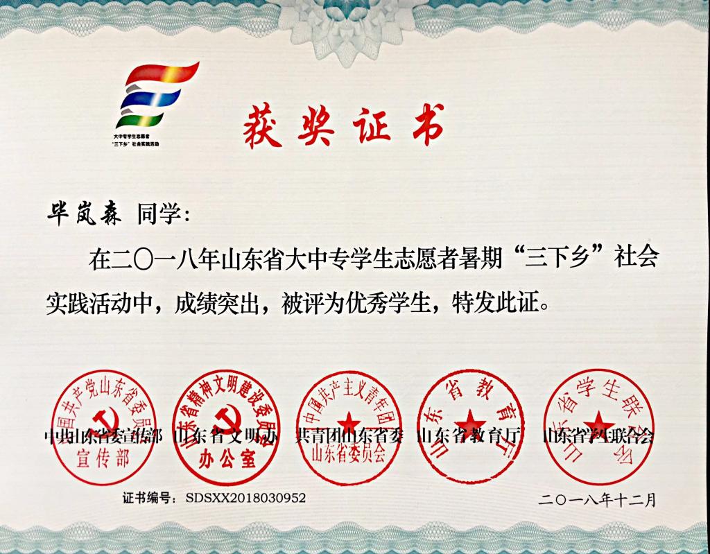 近日,2018年山东省大中专学生志愿者暑期文化科技卫生“三下乡”社会实践活动先进集体和先进个人的证书下发,永利yl23411no1“青岛科技大学赴长白山‘青春献祖国 致敬长白山’实践团” “青岛科技大学赴长白山‘青春献祖国 致敬井冈山’实践团”获“三下乡”社会实践省级优秀服务队, “青岛科技大学赴菏泽市机电荣耀下乡小分队”、“青岛科技大学赴丁里长镇张武屯村调研团”获“三下乡·千村行动”共青团助力扶贫专项行动省级优秀服务团队,曲智强、李东阳获 “三下乡·千村行动”共青团助力扶贫专项行动社会实践活动优秀指导教师,王娟娟、苗清获“三下乡”社会实践活动优秀指导教师,毕岚森等多名学生获 “三下乡”社会实践优秀学生。