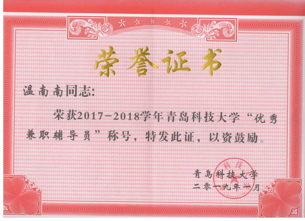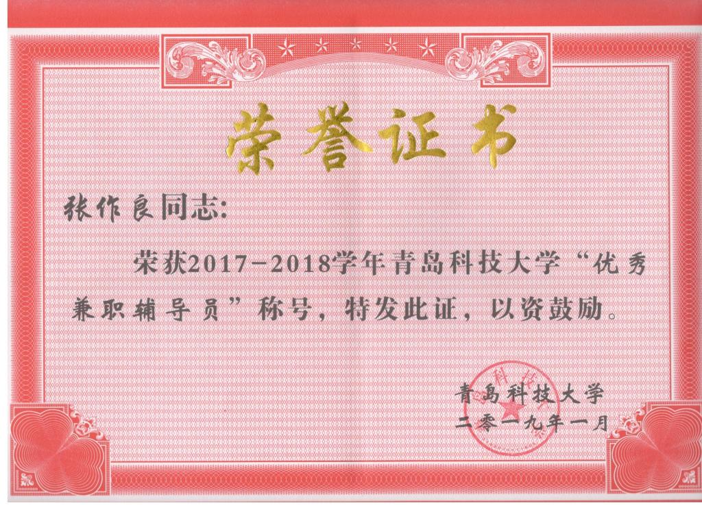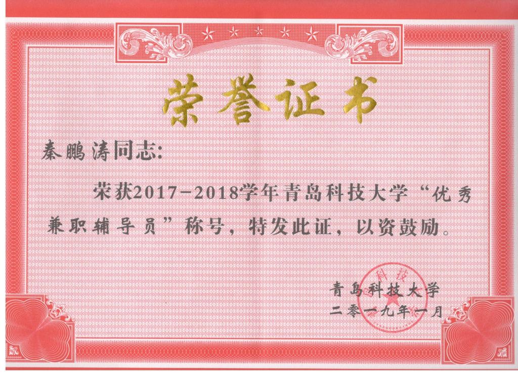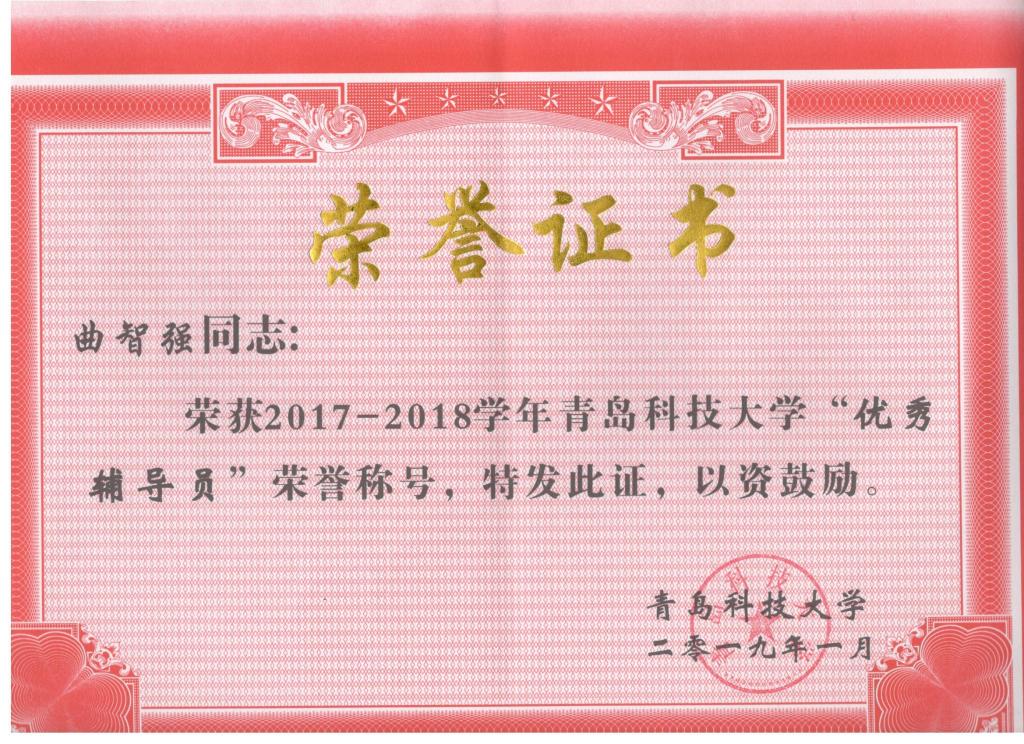 近日,在学校公布了2017-2018学年青岛科技大学优秀辅导员名单,永利yl23411no1曲智强老师荣获校优秀辅导员。