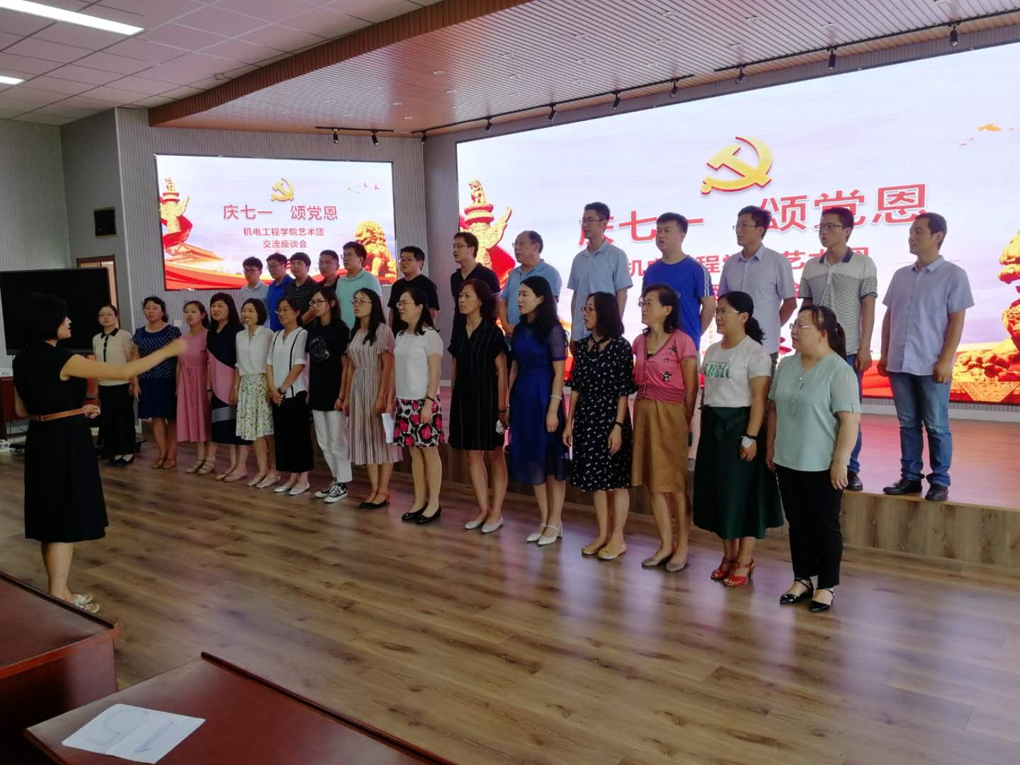 座谈会在热情激昂的合唱中拉开帷幕。朱惠华老师献唱《莫斯科没有眼泪》、李利老师一首《春闺梦》选段掌声阵阵,胡海明老师《歌唱祖国》饱含深情,付平老师感谢大家对学院分工会工作的支持并献唱《潇洒走一回》,王帅老师深情现场《我的祖国》,院党总支书记孙立军清唱《呼伦贝尔》并寄语在座各位老师一是要不忘党恩,不忘初心,一心跟党走;二是要有信心、培养兴趣爱好,陶冶情操,形成良好氛围。最后座谈会在集体高唱《歌唱祖国》与《没有共产党就没有新中国》中结束。