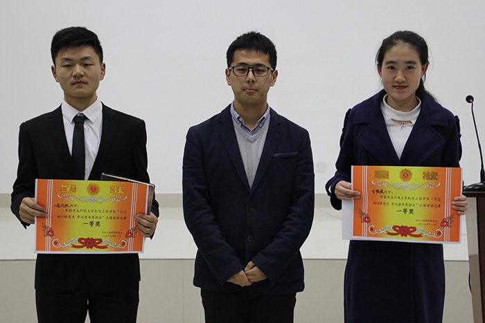 在主持人高翔的慷慨激昂的致辞中,演讲比赛正式拉开序幕。演讲比赛紧扣主题,选手们结合自身经历、所见所闻畅谈十九大。选手们通过列举中国古今为国奉献的英雄豪杰,畅聊我国硬实力软实力的卓越进步;引用先贤的名言警句,激励大学生有作为、敢担当。现场气氛浓厚,每一位选手都将自己的感想与感悟淋漓尽致用语言表现出来。选手们激情澎湃的演讲更是让现场的观众备受感染和鼓舞。经过激烈的角逐,程风林、李梦瑶荣获本次比赛一等奖。随后,曲智强老师、王娟娟老师、温南南老师分别为获得一、二、三等奖的同学颁奖。最后,曲智强老师为本次比赛作精彩的总结,表扬选手们在恶劣的天气下能够用演讲的激情驱散寒冷,感谢老师们同学们能够一直关注比赛,并希望大家认真学习党的十九大精神、学习十九大报告,将日常学习生活与十九大联系在一起。