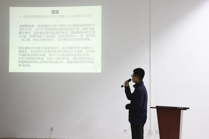 本次比赛包括自我介绍及才艺展示、现场选答和评委点评三个环节。在主持人刘宝忠精彩的开场白下,比赛正式拉开序幕,选手们闪亮登场,他们用自己独特的方式进行自我介绍,各个多才多艺,发挥特长向评委们展现自信的自己。接着,由选手在非凡逻辑、口才考验、情景设置和即兴播报四个类型中根据特长及意愿自行选择并应答,选手们灵活多变,良好的语言表达基础和临场应变能力充分展示出了他们扎实的主持功底。最后,由广播站优秀播音员田依林对选手的表现做了综合评价,充分肯定了部分选手良好的语言表达能力和临场应变能力,表达了对选手们决赛表现的期待并对此次活动的主办方表示了感谢。至此,永利yl23411no1第四届主持人大赛初赛在观众们热烈的掌声中圆满落下帷幕。